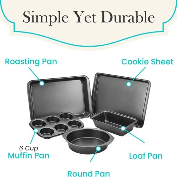 Everything You Need to Cook and Bake. Enhance your baking experience with this 5-piece baking pan set that includes everything you need for baking cakes, muffins, cookies, bread and oven roasting. This set is designed to make baking and roasting more enjoyable without the worry of messy clean-up afterwards.