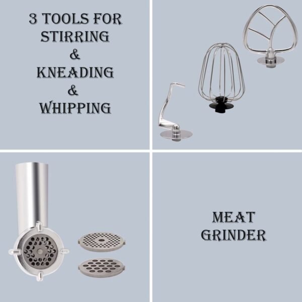 - 3 Removable components: Whisk, Dough Hook and Mixing Arm