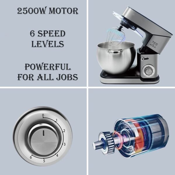 6 speed settings for different occasions with pulse function. Go from slow stirring to fast mixing with precise control at any speed. The slow first speed is ideal for kneading bread and reducing spatter when adding dry ingredients to wet ingredients. The high speed is ideal for whipping cream or meringue. The mixer has a blue LED light as a power indicator.